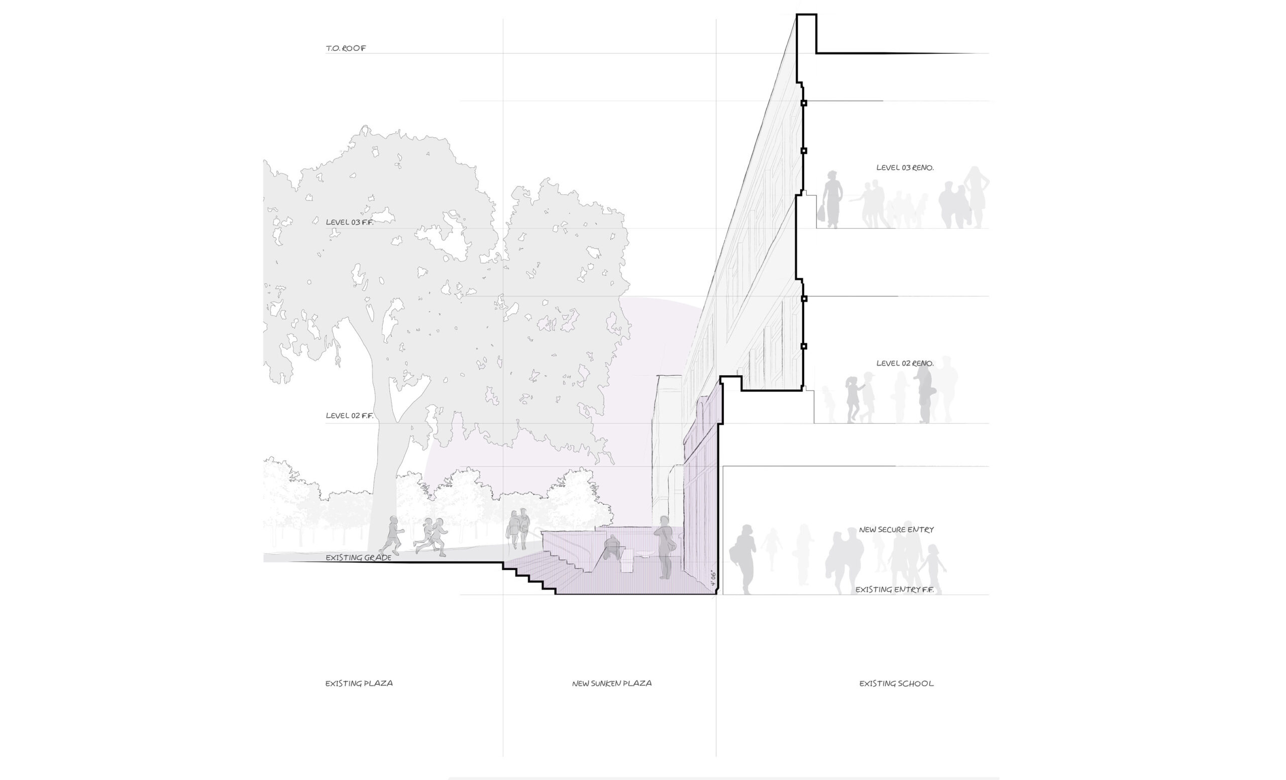 The design team worked closely with Dallas ISD and the community to address evolving needs, introducing creative solutions that balance preservation with innovation. A new sunken entry court and secure visitor entry enhance safety and accessibility, while thoughtful classroom relocations and a split-level addition connect learning spaces to the heart of the campus.